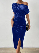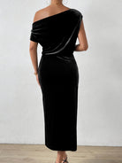 elegante off-shoulder zwarte midi-jurk voor vrouwen - chique    , knielengte met zijsplit, perfect voor lente & zomer, polyester blend, casual   gesofisticeerde   0