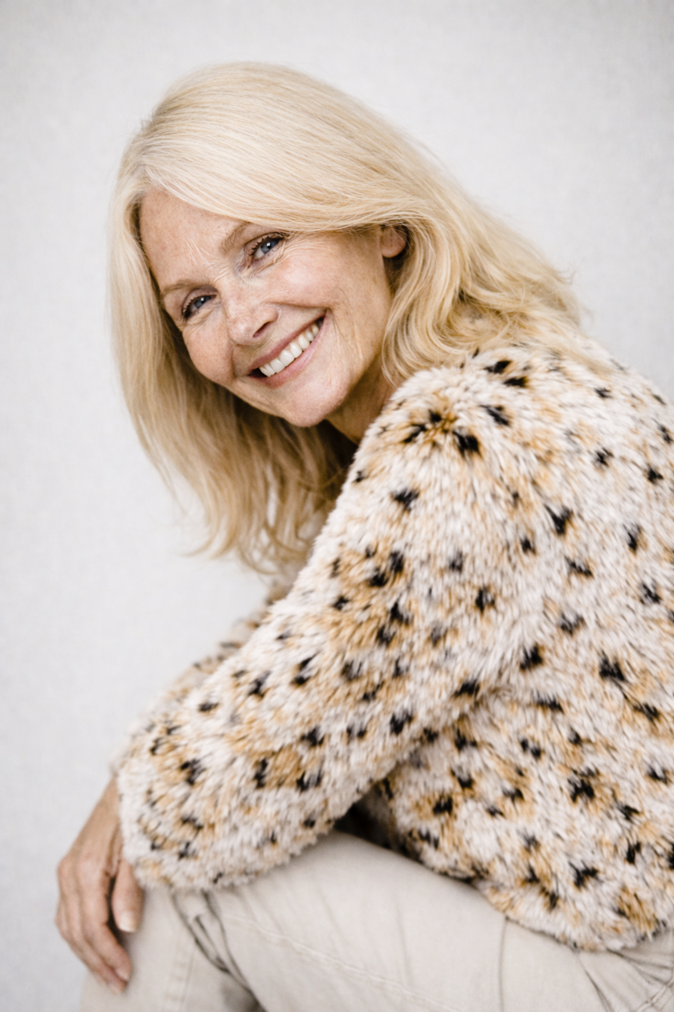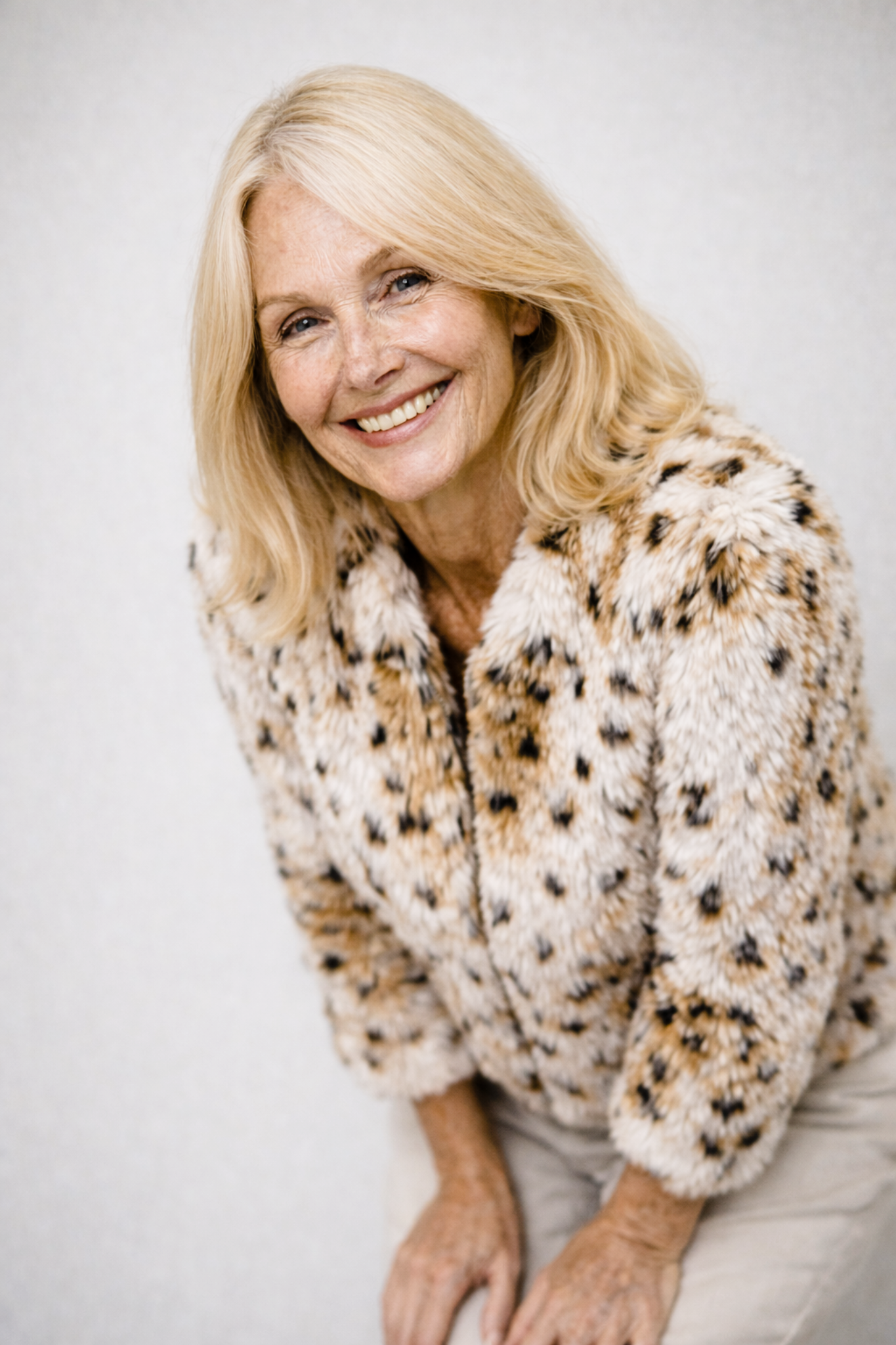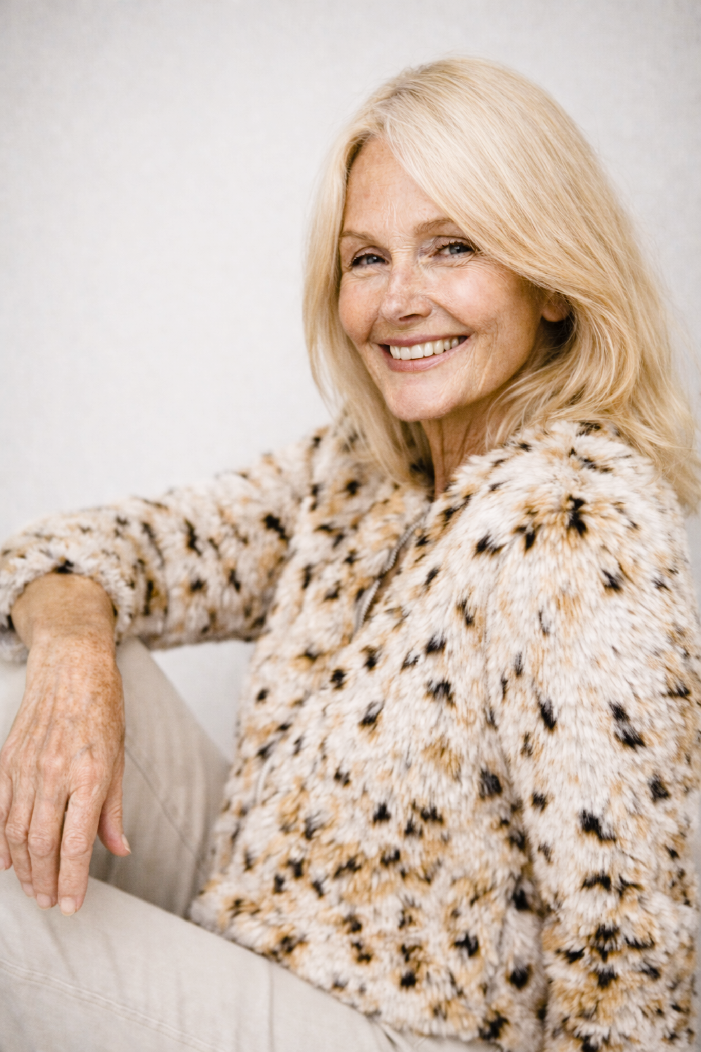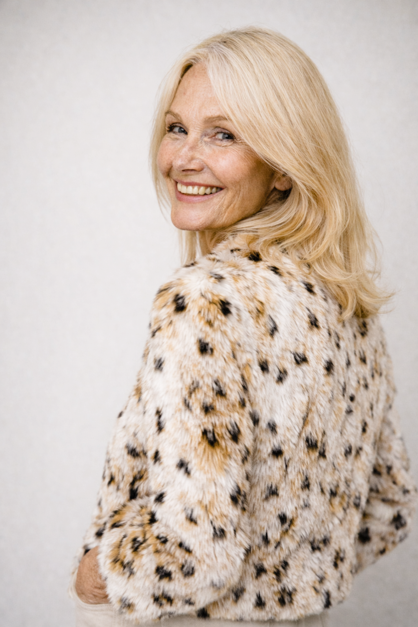 The soft faux fur texture combined with the elegant ivory leopard pattern creates a luxurious look that feels striking yet tasteful.