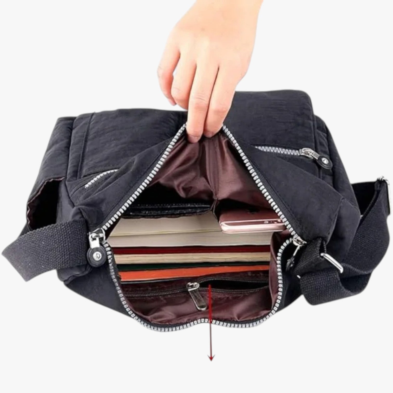 Thoughtfully designed interior compartments for keys, phone, wallet, and other essentials: find everything instantly without digging around.