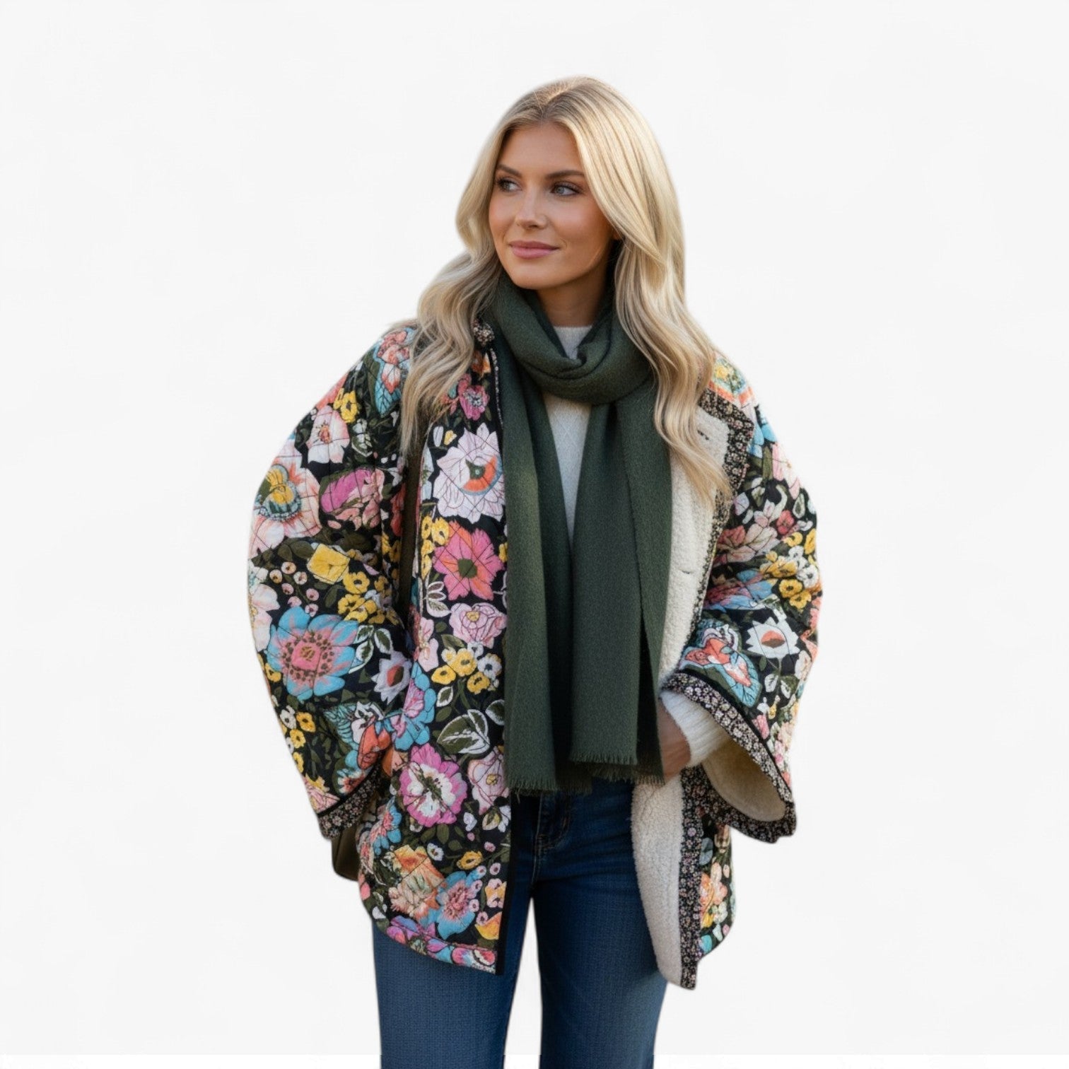 This reversible jacket with a floral design is an ideal addition to your winter wardrobe. It combines a beautiful floral exterior with a soft interior, providing both style and warmth for everyday wear and special occasions.
